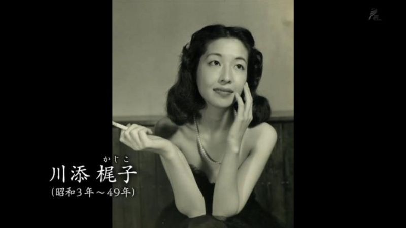 忽然一張黑白人物靜態寫真映入眼簾,是典型的1950年代的時尚:一位形貌旖麗的女性,柳葉眉,直挺的鼻樑,還有一雙不輕言妥協的剛毅眼神。她頸上掛串白珍珠項鍊,左右手肘以大腿為支點,放射成一個V字,右手食中指間刁一根燃燒的香煙,左手優雅地托腮擺pose,裸露香肩,視線略微上揚,彷彿一尊美麗的雕塑。接著字幕浮現,一個陌生名字:「川添梶子」,昭和時代的影星嗎?我不認識。然後左上角的番組(日文:節目)標題寫著:「街はこうして輝いた~六本木」(行道絢爛如斯:六本木)」,喔,回顧東京六本木發展沿革的專題。